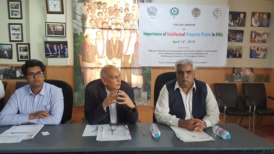 Manzoor ul Haq Malim Group Haead Sheikhupura chamber of commerce and industry, Mian Ehtisham Rasool Senior Vice President and Ali Raza Deputy Director PASTIC during Seminar on Importance of IPRs in SM